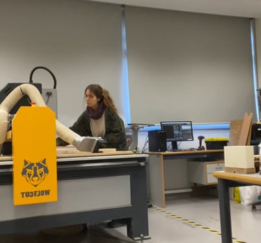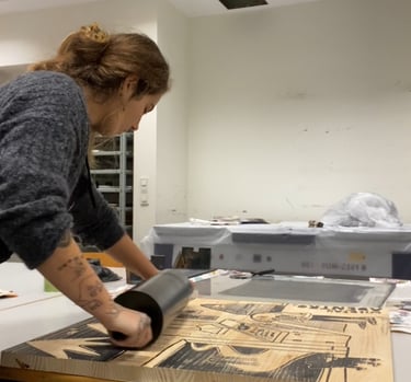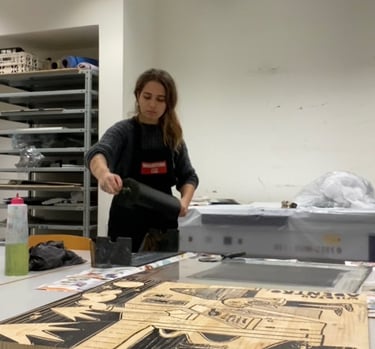 Una matriz de madera de pino tallada con fresadora CNC, entintada y estampada sobre tela mediante tórculo.