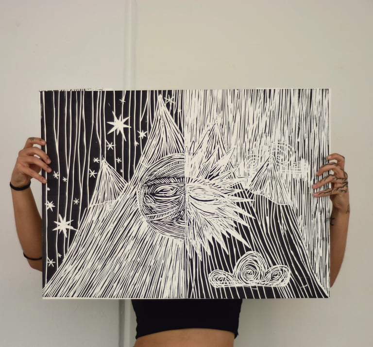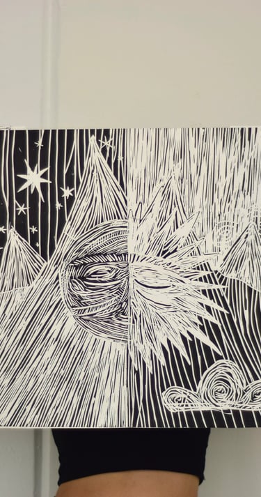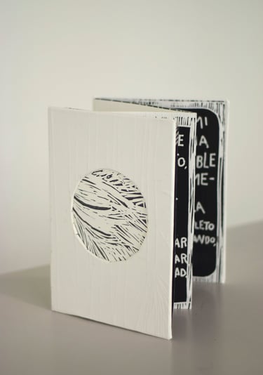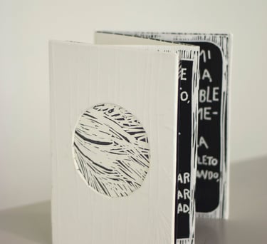 Edición de 6 ejemplares gofrados en papel blanco, cuyo interior consta de una serie de xilografías a partir de una matriz tallada manualmente.